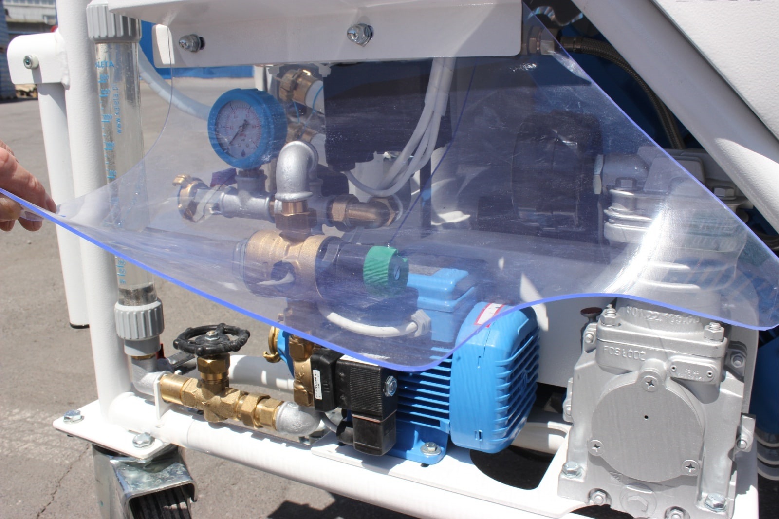 Машина работает от сети 380В, комплектуется усиленной шнековой парой, пылезащитными экранами, фиксатором и двумя входами для подачи воды. Для агрегатов данного типа рекомендуются ротор и статор на 380В.